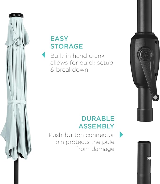 - USER-FRIENDLY MECHANISMS: Features a hand-operated crank to open and close the umbrella with ease, while a push-button tilt system adds extra protection for the sun
