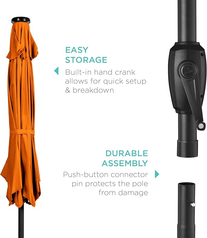 - USER-FRIENDLY MECHANISMS: Features a hand-operated crank to open and close the umbrella with ease, while a push-button tilt system adds extra protection for the sun