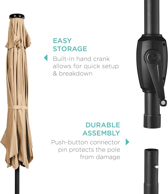 - USER-FRIENDLY MECHANISMS: Features a hand-operated crank to open and close the umbrella with ease, while a push-button tilt system adds extra protection for the sun