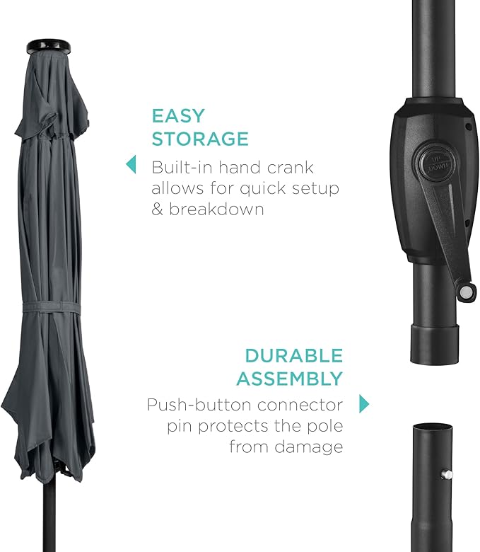 - USER-FRIENDLY MECHANISMS: Features a hand-operated crank to open and close the umbrella with ease, while a push-button tilt system adds extra protection for the sun