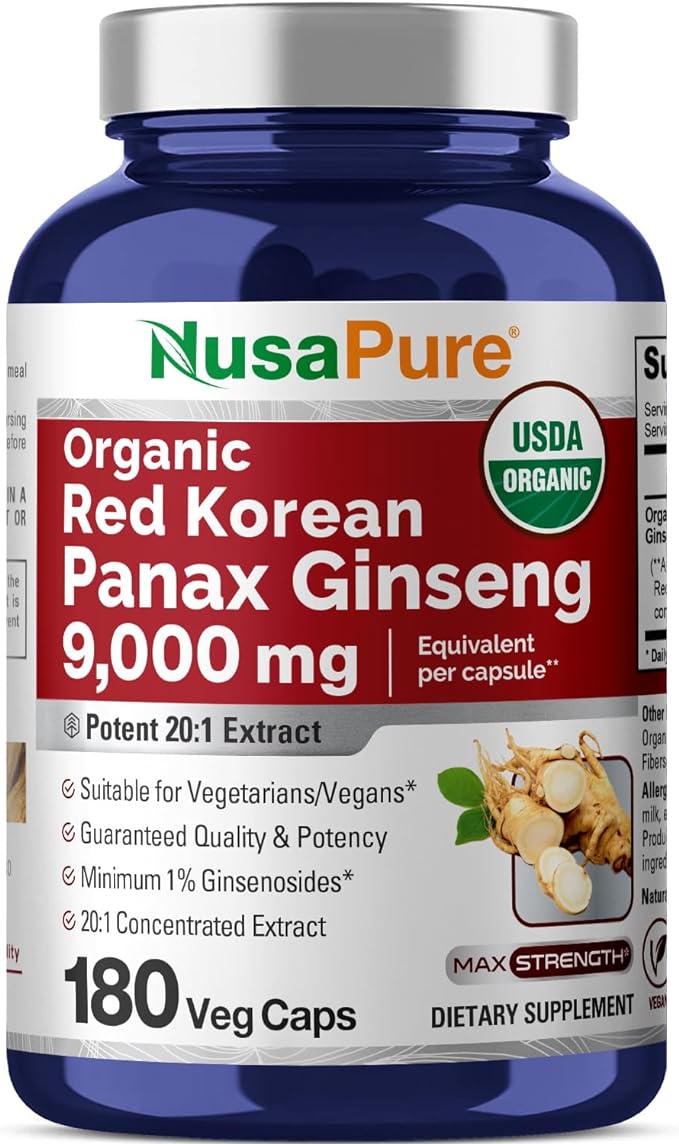 NusaPure Red Korean Panax Ginseng 9,000mg 180 Veggie Caps (USDA Organic, Non-GMO, Extract 20:1)