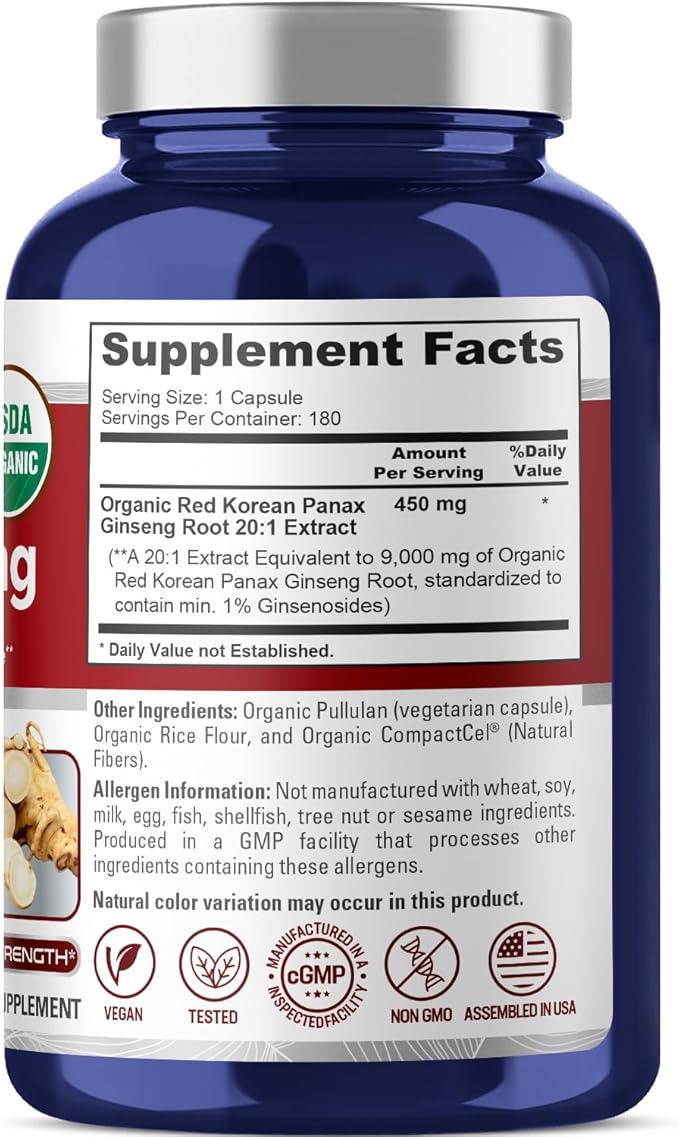- Organic Red Korean Panax Ginseng 9,000 mg per capsule. A 20:1 Extract equivalent to 9,000 mg of Red Korean Ginseng Roots.