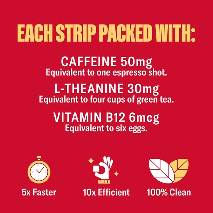 - Clean, Natural Energy: Our patented In a Strip technology packs each strip with more caffeine than an espresso – using natural L-Theanine, and vegan Vitamin B12. Enjoy stable energy without the jitters or crashes