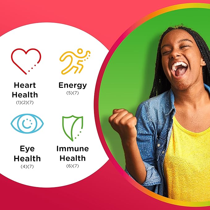 - Multivitamin gummy supports heart health (1)(2), normal brain function (3), eye health (4), daily energy needs (5) and normal immune function (6)(7)