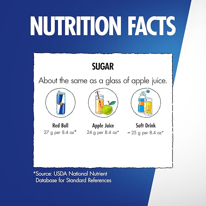 - Each 8.4 fl oz can contains 110 calories, 80mg of caffeine which helps to increase alertness, plus 26g of real sugar similar to a glass of apple juice of the same size