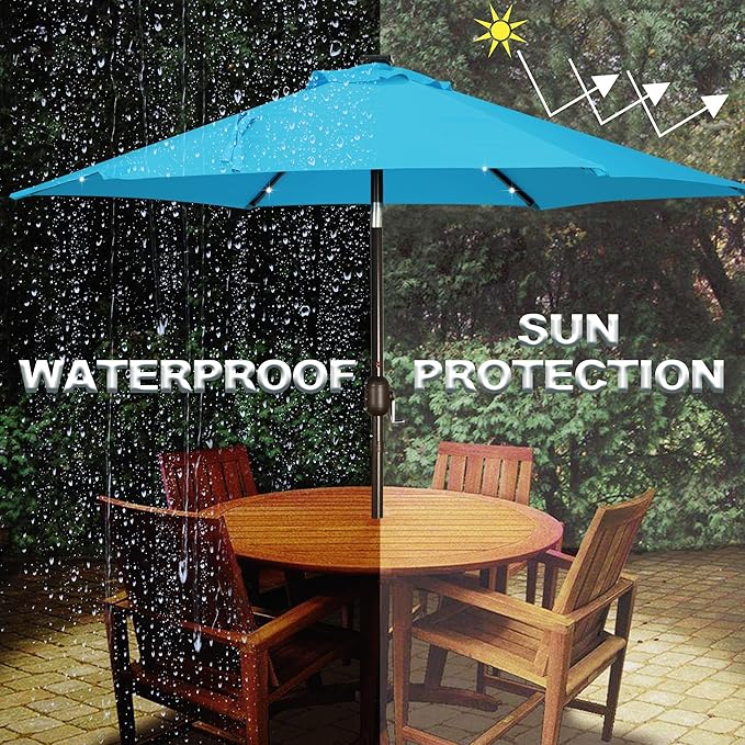 - Quality Material -- This solar umbrella with dia. 1.5 inch (38 mm) rust-free bronze aluminum & iron pole and 6 iron ribs provide stronger support. The breathable fabric avoid harmful UV rays and guards against water, long lasting. With the top air vent, this LED lighted market umbrella provide a perfect shade for your patio, garden, deck, backyard, pool.