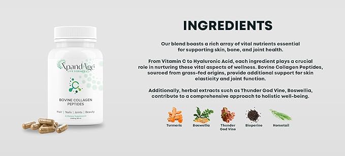 XpandAge's Bovine Collagen Peptides contain Biotin, Niacin, Vitamin C, Vitamin D, Thiamin, Paba, Hyaluronic acid, Turmeric, Bioperine, and more for healthy Hair, Nails, Beauty, Joint, and Bone health.