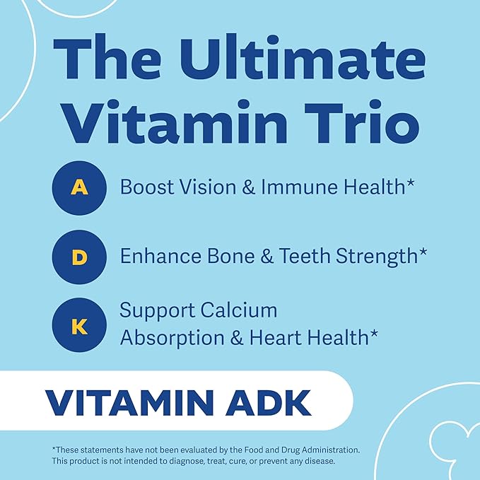 - BONE, VISION, HEART, IMMUNE SUPPLEMENTS : Vit A is essential for vision, maintaining body's natural defenses, and enhances the effect of D3K2. Vit D is vital for strong and healthy bones, and promoting immune functions. Vit K2 supports heart and cardiovascular health by regulating calcium build up in the arteries, and enhancing bone and teeth health. Consume ADK together as each vitamin complements its benefits.
