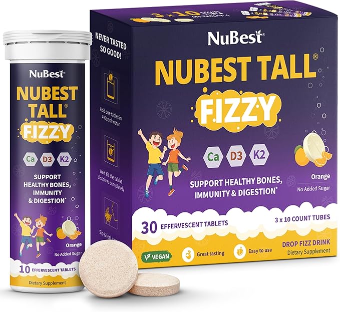 - STRONG BONES, HAPPY KIDS: NuBest Tall Fizzy offers a tasty, bone-strengthening boost for kids and teens with Calcium from red algae, Magnesium, Vitamin K2, and D3. Developed by U.S. Nutritionists and made in an FDA-registered, GMP-certified facility, these natural orange tablets contain under 1g of sugar and are free from GMOs, gluten, soy, grain, and wheat. They support bone strength, digestion, and immunity, making them a top choice for parents seeking quality supplements for growing children.