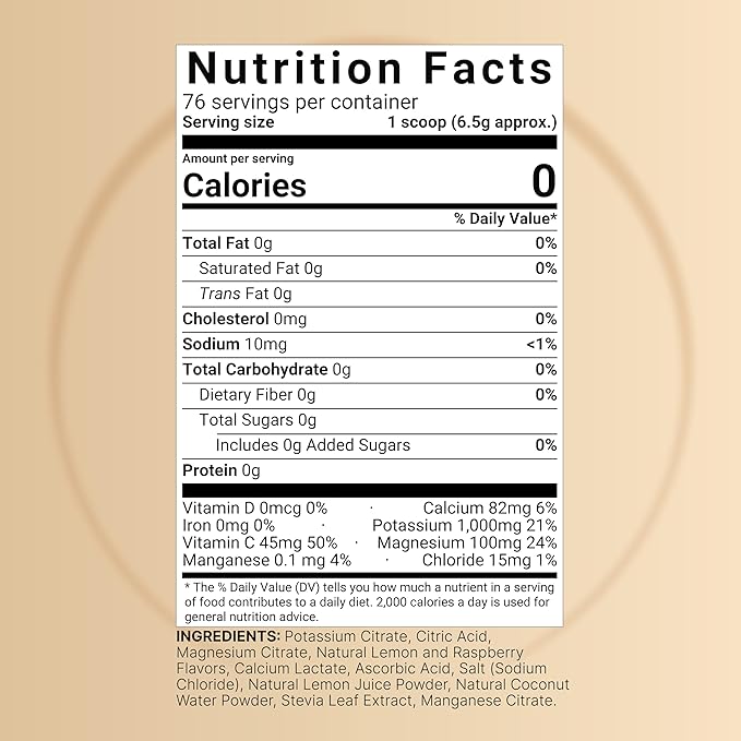 - Each serving provides a high level of 1,000mg potassium, as well as containing calcium, magnesium, and salt, then combined with real lemon juice and coconut water for max benefits
