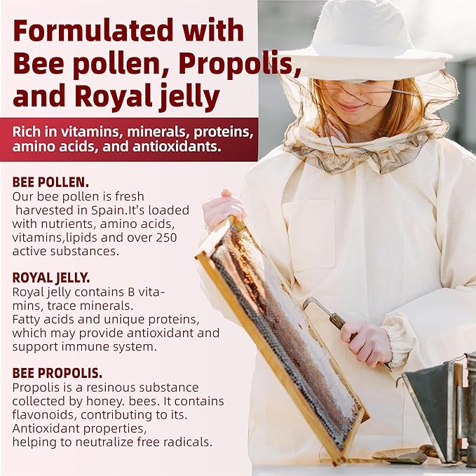 - Special Ingredients : Vitamin D3,Calcium,Inositol, Vitamin A,B-complex,B9,B12,B6, Bee Pollen,Propolis,Royal Jelly