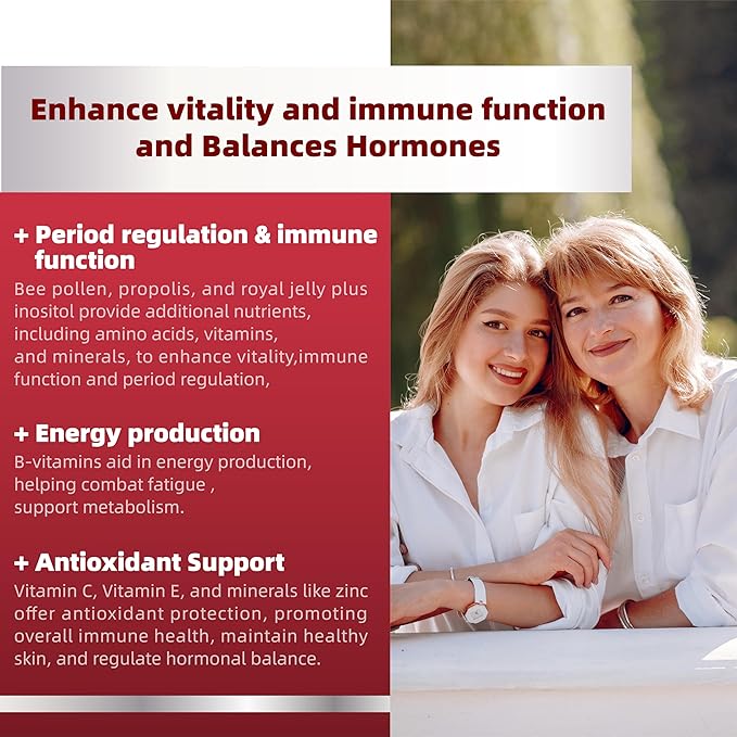 - 💪 Helps Maintain Good Health For Women AGE 50+ : Embrace balance and well-being with our unique blend of natural enhancers including Inositol,Bee Pollen, Propolis Extract, and Royal Jelly. These ingredients are renowned for their ability to support hormonal balance and enhance immune health, giving you the resilience to thrive in your busy life.