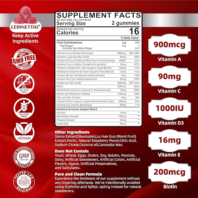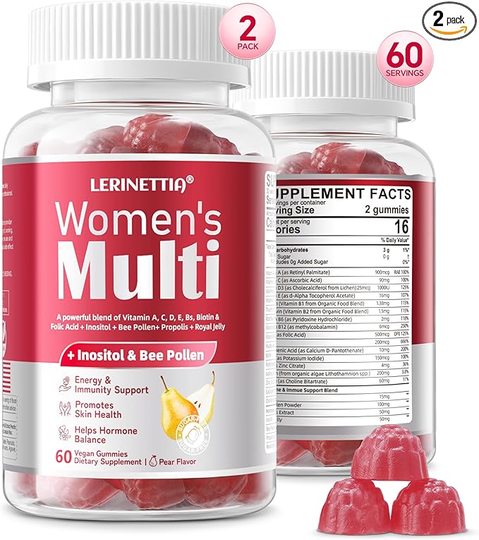 - 😋 Women’s One 50+ High-Potency Multivitamin : Try our daily womens multivitamin gummy with all 20 essential vitamins and minerals: Vitamin A, C, D3, E,Iodine,Choline B-complex, calcium,inositol,Bee Pollen & zinc..Our formula provides 100% of your daily requirements for key vitamins such as Vitamin A, C, D, and E, ensuring a robust foundation for maintaining optimal health without risking the potential dangers of high dosages.
