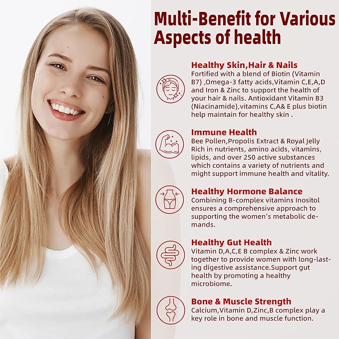 - 💃 Women's Multivitamin plus seven complex B vitamins for men and women : Vitamin B12 provides wide-ranging support for energy, Thiamin (B1) for neurotransmitter synthesis,Riboflavin(B2),B5 may impact skin health ,B6 for metabolism and vitamin B9 for immune function. It's a vitamin B formula in Multivitamins for different women age groups ; It's also super B complex designed for all.