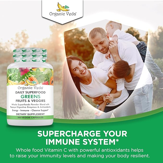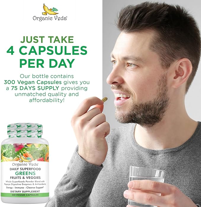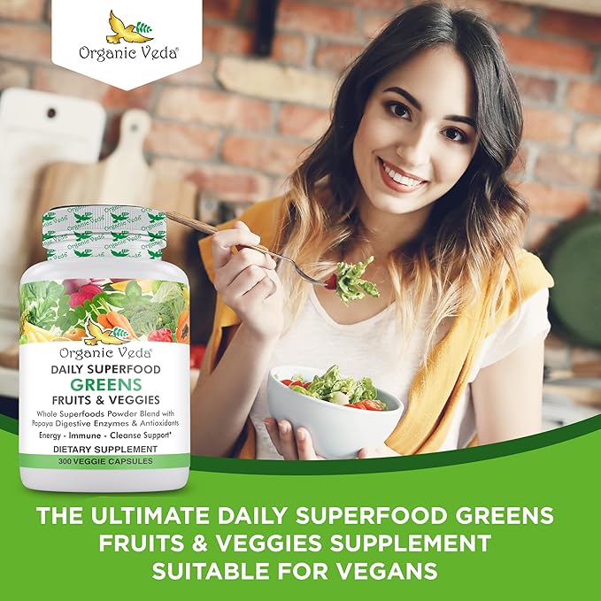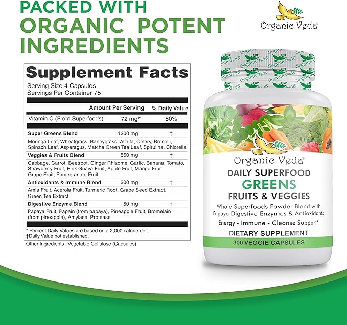 Organic Veda Superfood Greens Fruits & Vegetables 300 Capsules | 30 Daily Organic Fruits & Veggies with Chlorophyll, Papaya Enzymes, Acerola Vitamin C, Turmeric, Beet, Moringa, Green Tea Extract