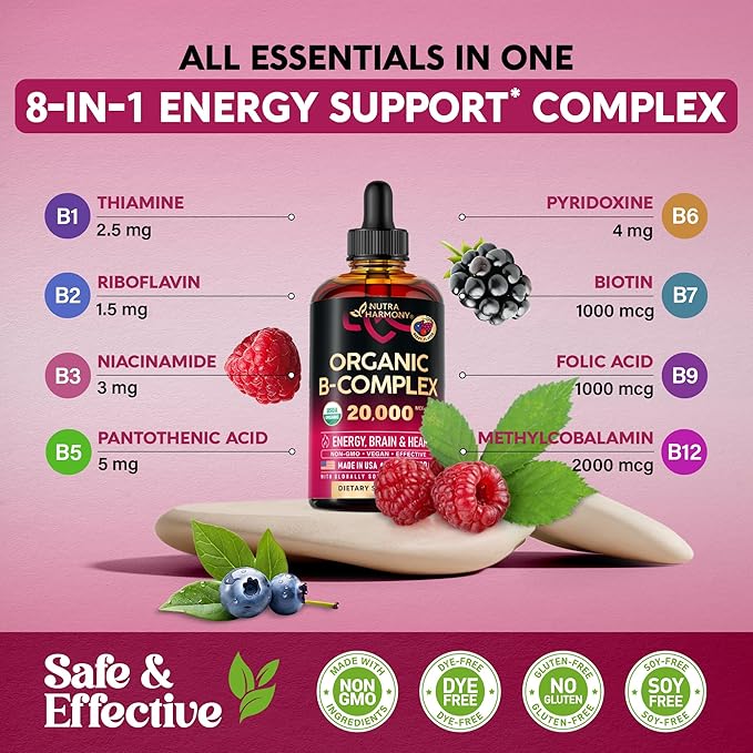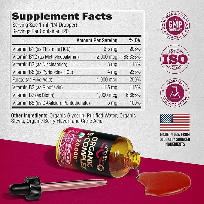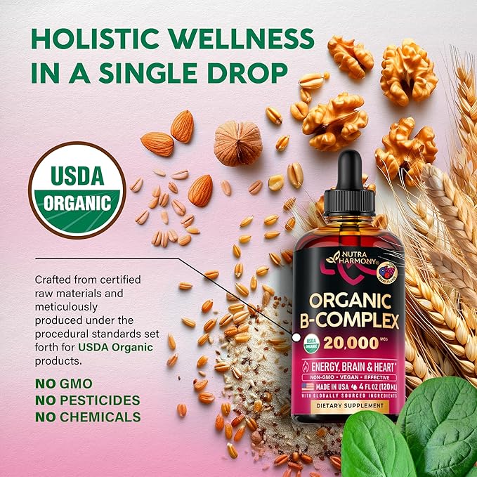 - ❤️ USDA Organic Vitamin B Complex – Empower energized & vibrant you with our premium quality USDA-organic liquid b complex drops with vitamin B5 & Methylcobalamin B12. Organic vitamin b complex B1, B2, B3, B4, B5, B6, B7, B9 & B12 are designed to supercharge energy levels, this liquid powerhouse is a go-to source for feeling more alive and vibrant daily.