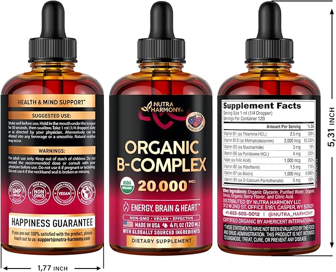 - ❤️ Made with Care & Love – At NUTRAHARMONY, we desire to provide you with quality and outstanding service. If, for any reason, you are not happy with b complex liquid drops, just let us know! Drop a message to share your experience with b vitamins complex B1, B2, B3, B4, B5 Pantothenic Acid, B6, B7, B9 & Methylcobalamin B12!