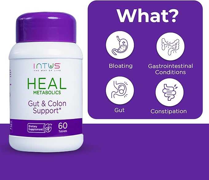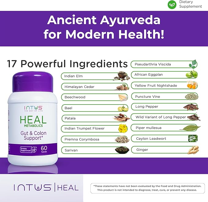 - Intus Heal supports gut health with a blend of 17 Ayurvedic herbs. This supplement promotes digestive balance, offering comprehensive support for men and women seeking natural wellness.