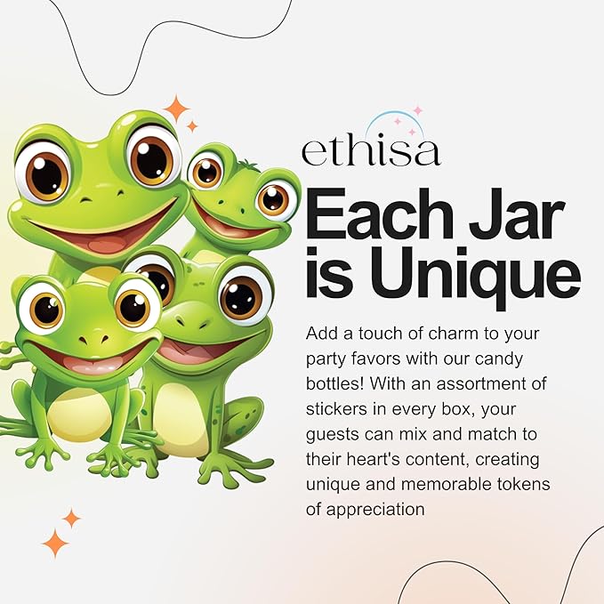 - UNIQUE JARS - Each package comes with 12 unique frog stickers to add a personalized touch to each bottle. Send everyone home feeling appreciative of the extra creativity in your thoughtful keepsakes