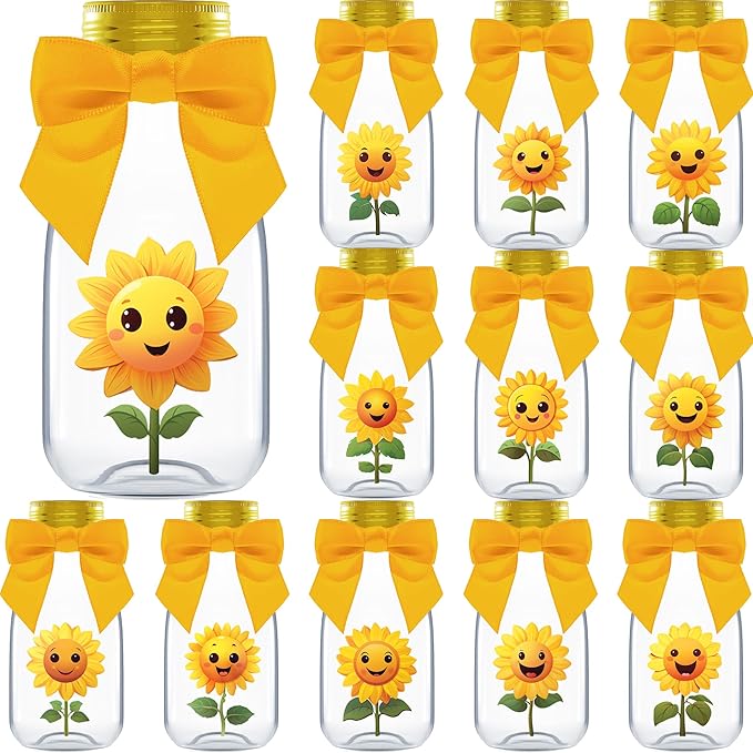 Small 12 Pack Sunflower Party Favors - DIY Candy Jars with Ribbons and Stickers - Party Decoration Bottles for Birthday, School Classroom, Baby Shower, Bridal Shower, and Wedding - Sun Flower