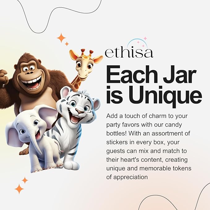 - UNIQUE JARS - Each package comes with 12 unique safari stickers to add a personalized touch to each bottle. Send everyone home feeling appreciative of the extra creativity in your thoughtful keepsakes