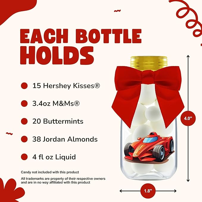 Small 12 Pack Race Car Party Favors - DIY Candy Jars with Ribbons and Stickers - Party Decoration Bottles for Birthday, School Classroom, and Baby Shower - Racecar Table Centerpiece for Kids