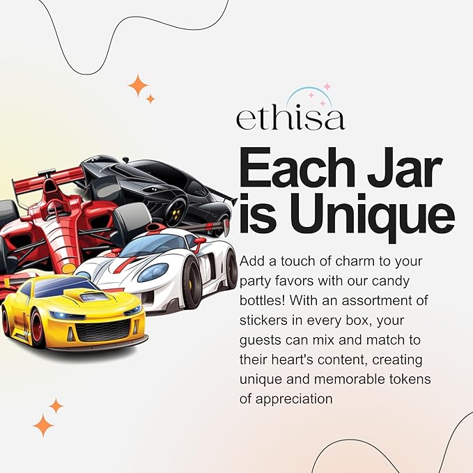 - UNIQUE JARS - Each package comes with 12 unique race car stickers to add a personalized touch to each bottle. Send everyone home feeling appreciative of the extra creativity in your thoughtful keepsakes
