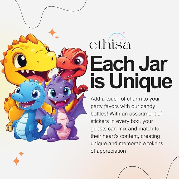 - UNIQUE JARS - Each package comes with 12 unique dinosaur stickers to add a personalized touch to each bottle. Send everyone home feeling appreciative of the extra creativity in your thoughtful keepsakes