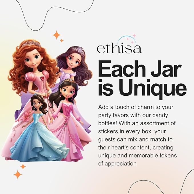 • UNIQUE JARS - Each package comes with 12 unique princess stickers to add a personalized touch to each bottle. Send everyone home feeling appreciative of the extra creativity in your thoughtful keepsakes