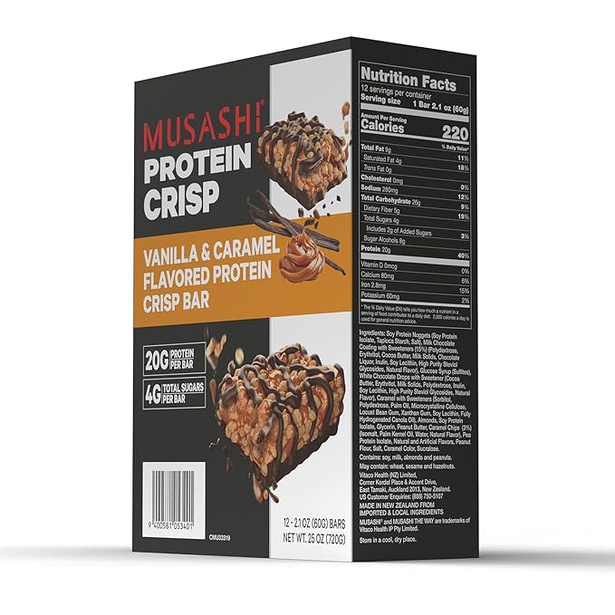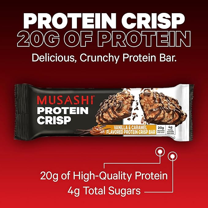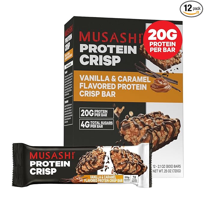 MUSASHI Protein Crisp Bar, 20g Protein, 4g Total Sugars, Vanilla & Caramel, Post Workout and Snack On The Go, 12 Pack of 2.1oz (60g) Bars