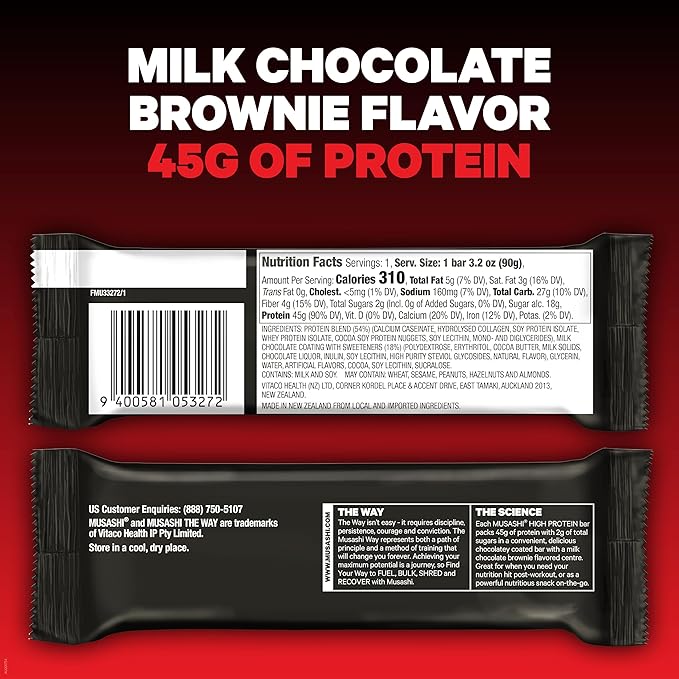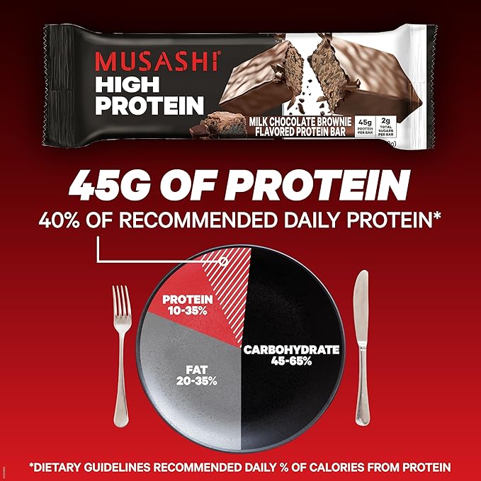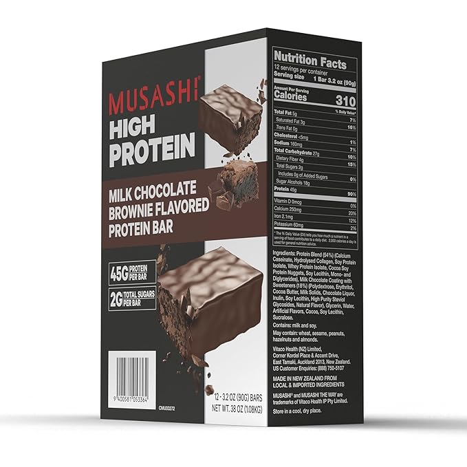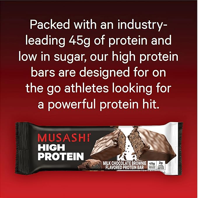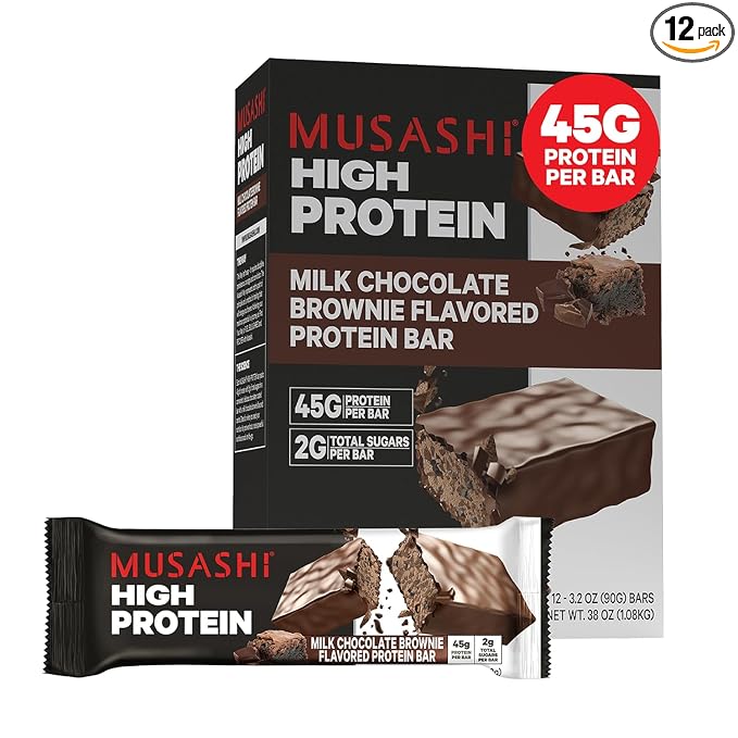 MUSASHI High Protein Bar, 45g Protein, 2g Total Sugars, Milk Chocolate Brownie, Post Workout and Protein Snack On The Go, 12 Pack of 3.2oz (90g) Bars