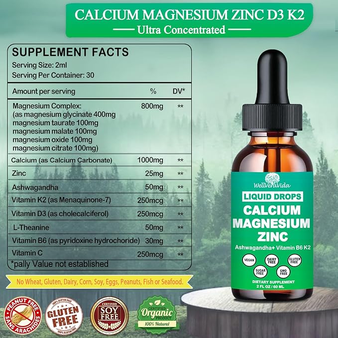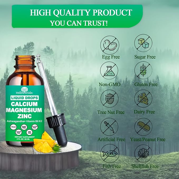- Pure & Uncompromising Quality: WellVeraVida's liquid Calcium Magnesium Zinc and D3 supplement, boasting a refreshing fruit flavor, is tailored for both gentlemen and ladies alike. Our commitment to purity means zero artificial fillers, flavors, preservatives, or additives. Every calcium drop is 100% Vegan, non-GMO, and free of gluten, dairy, soy, eggs, fish, shellfish, tree nuts, and peanuts. Whether you're a kid, a woman, or a grown man, WellVeraVida's liquid calcium supplement are the perfect choice for your health and well-being. Trust in our unwavering dedication to purity and quality