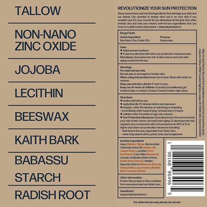 - Natural & Pure Ingredients: Formulated with 100% grass-fed tallow and zinc oxide, Sky and Sol sunscreen is free from processed seed oils, fragrances, preservatives, and chemical UV filters. Enjoy sun protection that’s as pure as it is effective.