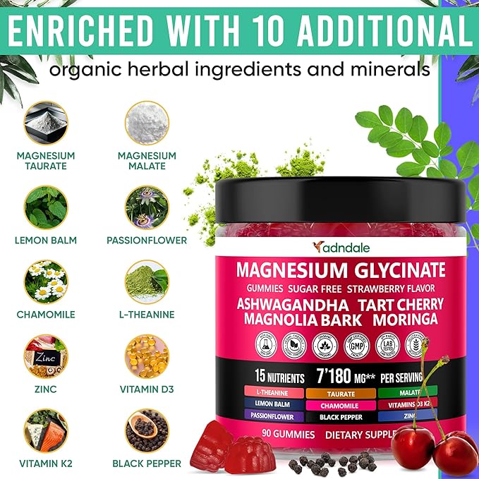 - VEGAN, GLUTEN-FREE GUMMIES FOR THE ENTIRE FAMILY, INCLUDING KIDS: Adndale Magnesium Glycinate Plus+ gummies cater to the entire family, including children, with a vegan-friendly and gluten-free composition. This aligns with dietary preferences and health-conscious lifestyles, providing a convenient means to support relaxation and overall wellness.