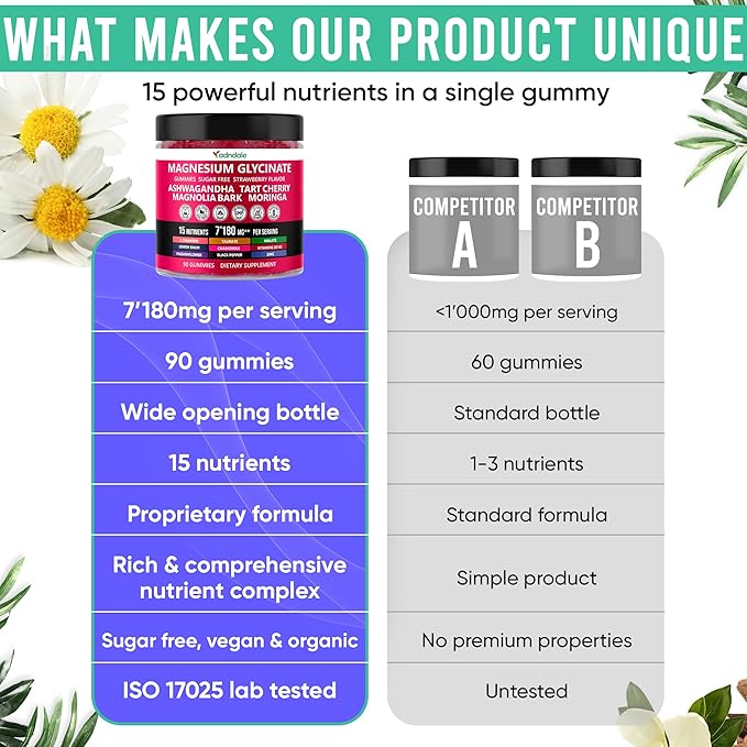 - ASHWAGANDHA AND LEMON BALM FOR EFFECTIVE STRESS RELIEF: Magnesium Glycinate gummies further integrate 400mg of Ashwagandha—an herb recognized for stress reduction—and 300mg of Lemon Balm, known for its calming effects. This synergistic blend targets the cultivation of a calm and balanced state of mind, facilitating relaxation and supporting a rejuvenating resting experience.