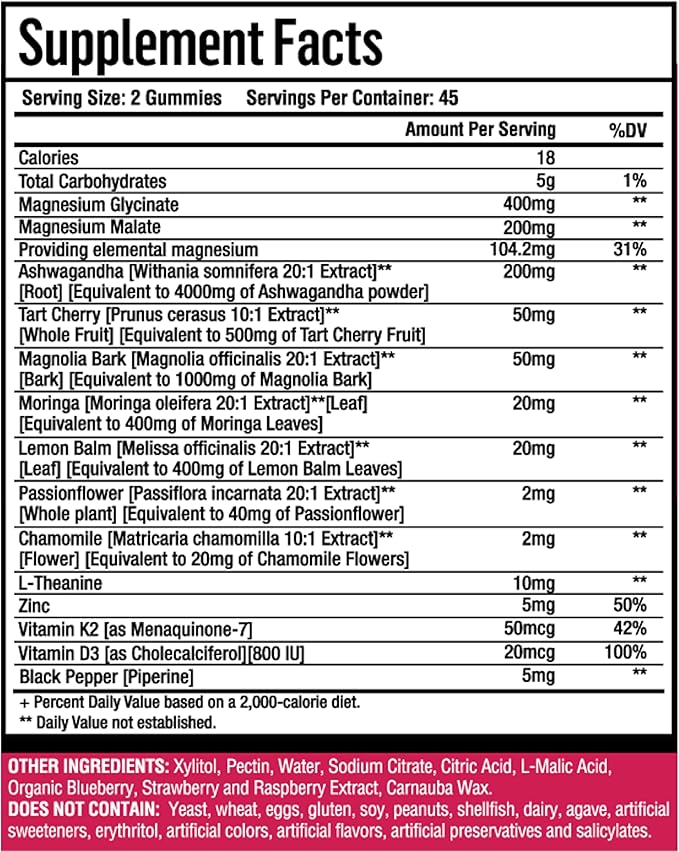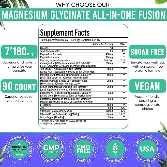 90ct 15-in-1 Magnesium Glycinate Gummies 400 mg/serv- with Magnesium Malate, Ashwagandha, Tart Cherry, Magnolia Bark, Lemon Balm, Passionflower, Chamomile, L-Theanine, Zinc, Vitamin K2 & D3