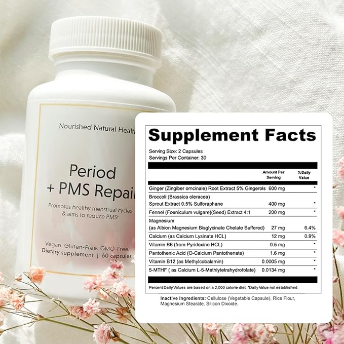- ALL NATURAL FORMULA -The nutrients and plants in this formula are designed to alleviate overwhelming PMS symptoms.* It includes a combination of vitamins and minerals with plant-based ingredients, including Ginger, Broccoli, Fennel, Magnesium, Calcium, and B-complex vitamins to reduce symptoms while promoting liver detoxification and methylation processes for a healthier cycle. *