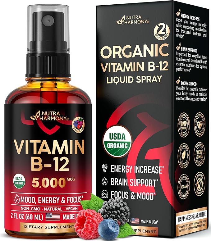 - Made with Care & Love — At NUTRAHARMONY, we desire to provide you with quality and outstanding service. If, for any reason, you are not happy with Organic vitamin B12 liquid, just let us know! Drop a message to our support team to share your outstanding experience with B12 liquid vitamins in a spray! And remember, we care for your well-being!