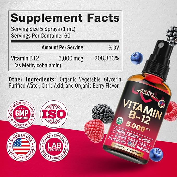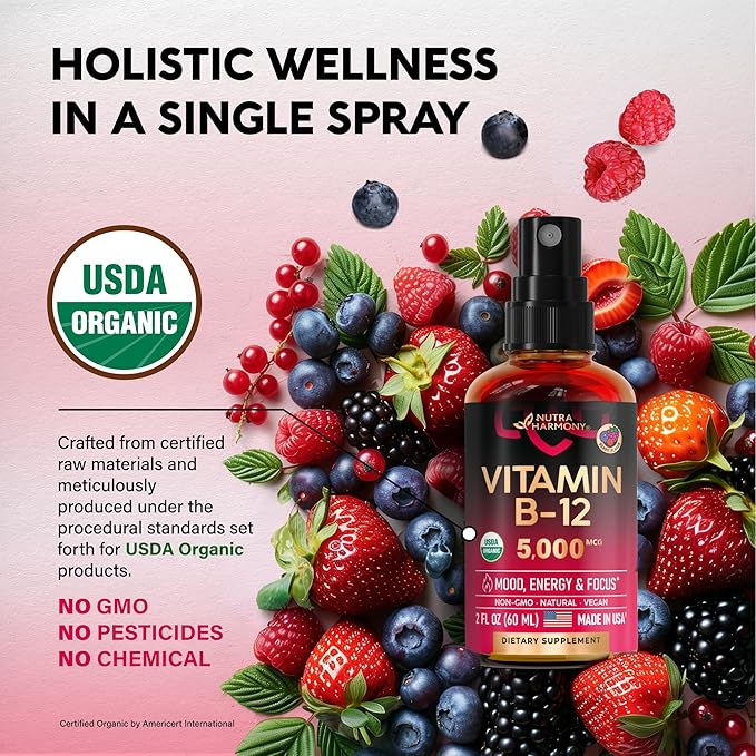 NUTRAHARMONY USDA Organic Vitamin B12 Spray - 5000 mcg Liquid Vegan Methylcobalamin for Women & Men - Energy Boost, Focus & Mood, Brain Health Support - Maximize Absorption - 2 Month Supply, 2 fl oz