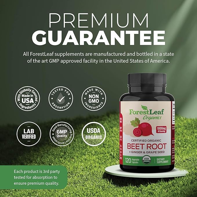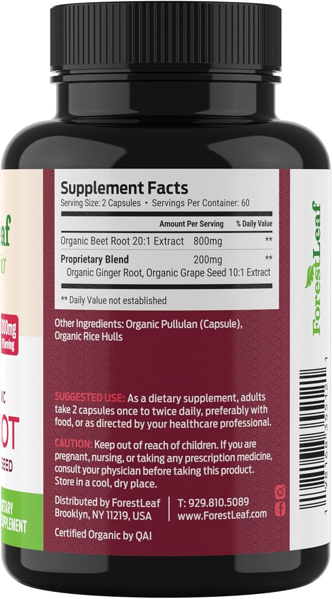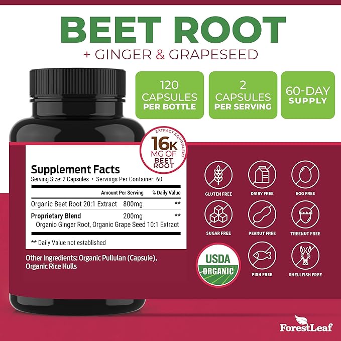 ForestLeaf Organic Beet Root Capsules - with Ginger & Grape Seed 16000mg Strength 20:1 Extract, Supports Nitric Oxide Production, Beets Supplements with Organic Non-GMO Beetroot Powder 120 Veggie Caps