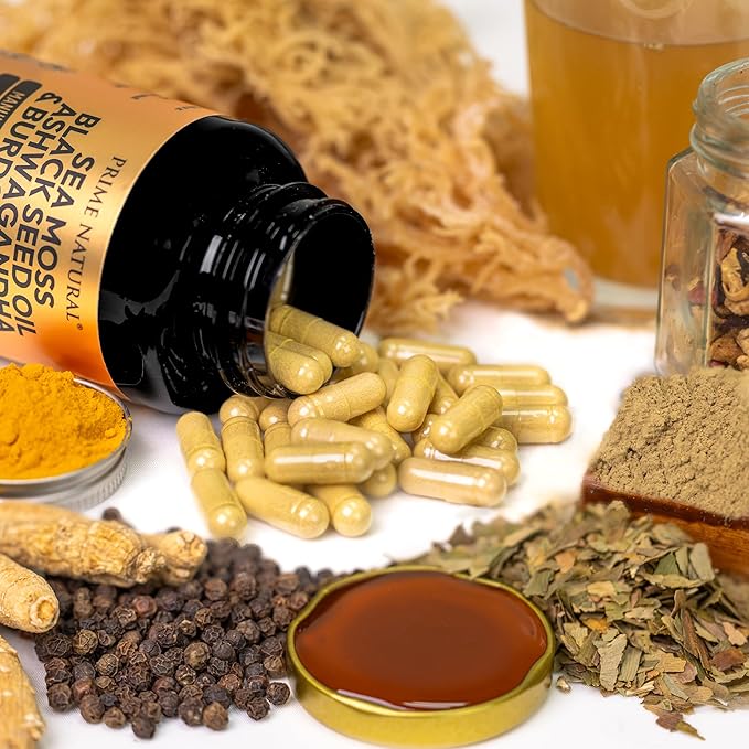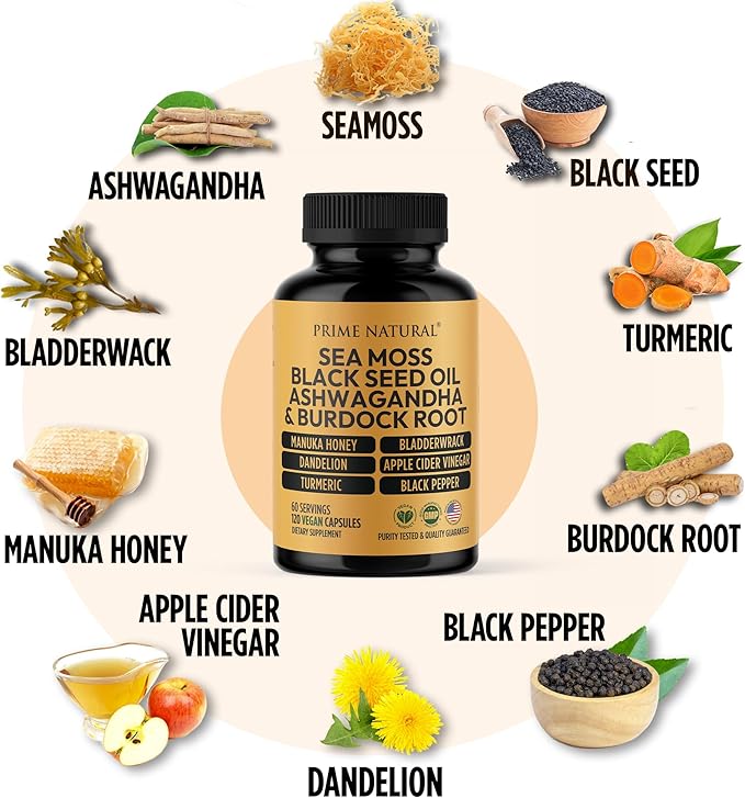 - IMMUNE SYSTEM SUPPORT: Sea moss, black seed oil, ashwagandha, manuka honey, and turmeric may aid in supporting and strengthening the body's immune function.
