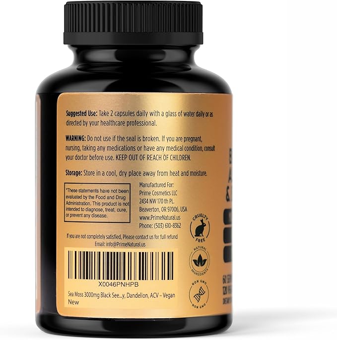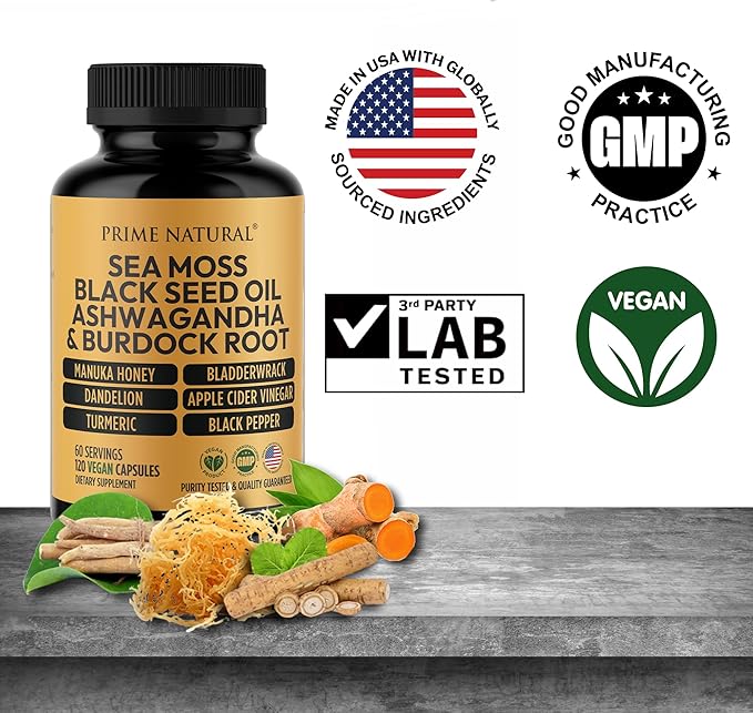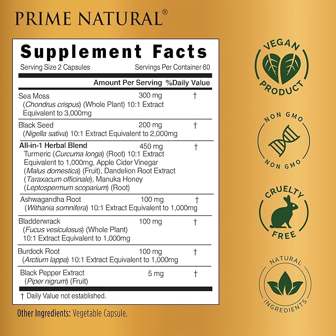 Sea Moss 3000mg Black Seed Oil 2000mg Ashwagandha 1000mg Turmeric 1000mg Bladderwrack 1000mg Burdock 1000mg Manuka Honey Dandelion ACV - 120 Capsules | 60 Days Supply | Vegan