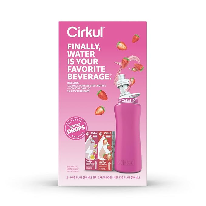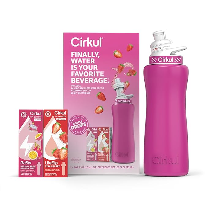 Cirkul 32oz. Hot Pink Stainless Steel Water Bottle Starter Kit with Pink Lid and 2 Flavor Cartridges (1 LifeSip Strawberry, 1 GoSip Passion Fruit Dragon Fruit) Zero Calories and No Sugar