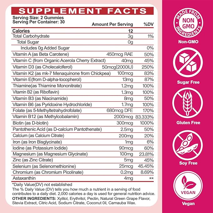 - Complete Women's Multivitamin & Multimineral: Our womens daily multivitamins gummies provide key essential vitamins and minerals to meet or exceed your daily needs. Multi vitamin gummies for women Packed with 20+ womens vitamins, minerals & essential nutrients to support overall health & wellness. Including Astaxanthin, vitamin D3+K2, omega-3 and B vitamins, It’s a feel-good formula your body will love!
