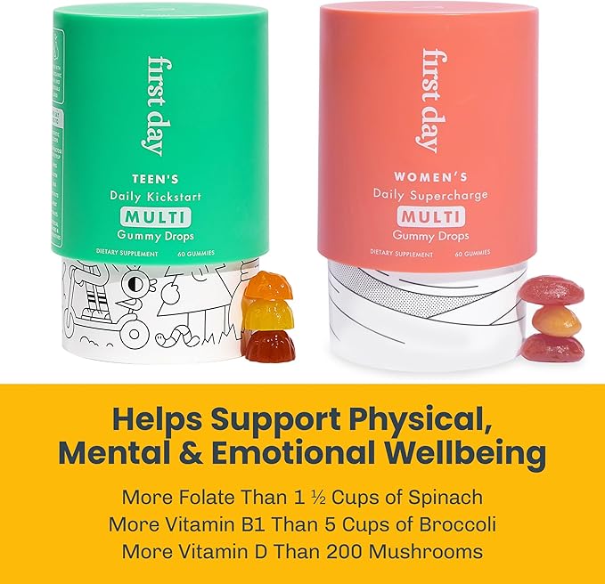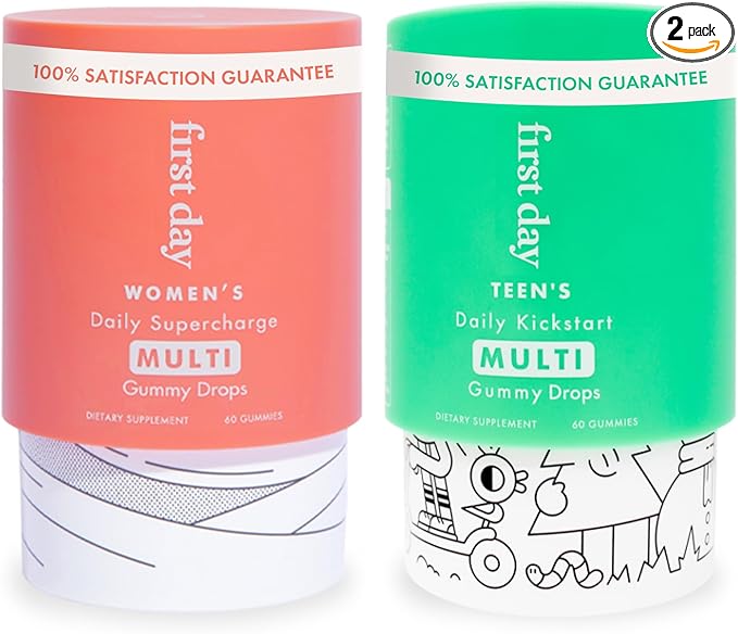 FIRST DAY Multivitamin Gummies Bundle for Women & Teens – Vitamins A, B, C, D & K + Folate, Magnesium, Zinc, Biotin & More – Made w/Organic Fruits & Veggies, Only 2g Sugar – 2-Pk, 30 Day Supply Each