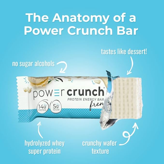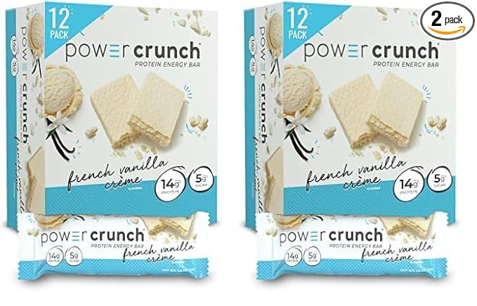 - DELICIOUS TASTING WHEY PROTEIN BARS Power Crunch Bars are the perfect protein snacks. With 14 grams of protein and only 5 grams of sugar, these French Vanilla Crème energy bars are the ideal snacks. Great for Back to School