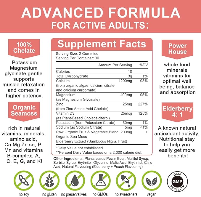 - Best Absorb & Bioavaible: Our Calcium Magnesium Supplements are expertly formulated, Whole Food nutrients, these High Potency Term are made with superior synergistic active ingredient natural calcium, magnesium glycinate, and Potassium D3 zinc, For extra strength we added Organic Sea Moss and Elder rich in natural vitamin minerals, Studies show seamoss calcium absorption up to 96%