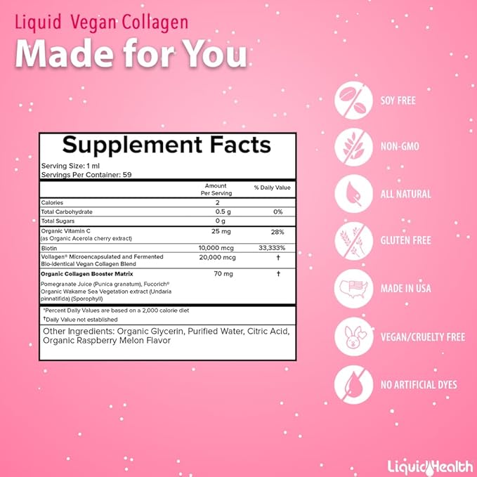 - VEGAN COLLAGEN DROPS FOR HEALTHY HAIR, SKIN, & NAILS: Liquid Health's Vegan Liquid Collagen drops are the first of their kind! Made with 100% plant-based Vegan Collagen AKA "Vollagen" and essential vitamins and minerals to support your body's natural collagen production. Nourish your body from the inside out for lustrous shiny hair, hydrated glowing skin, strong healthy nails, and a boosted metabolism.