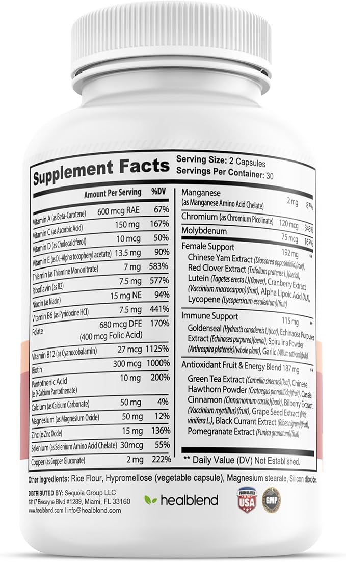 - Energy and Creativity: Womens vitamins supplement contains a complex of B vitamins, as well as extracts of ginkgo biloba and other herbs that may enhance energy and improve mood, which may increases the overall sense of well-being.