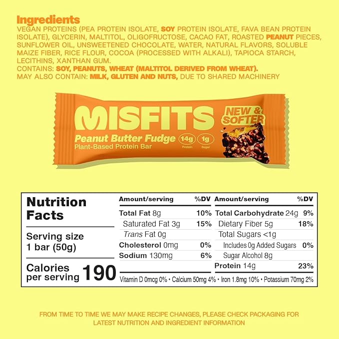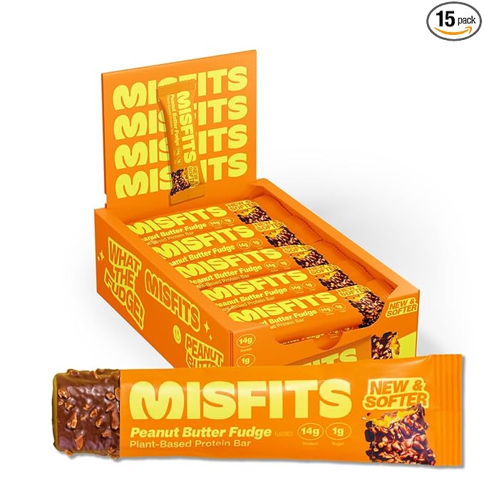 Misfits Vegan Protein Bars, Peanut Butter Fudge - Updated Recipe | Plant Based, Low Sugar & Carb, High Fiber Snacks | Pack of 15
